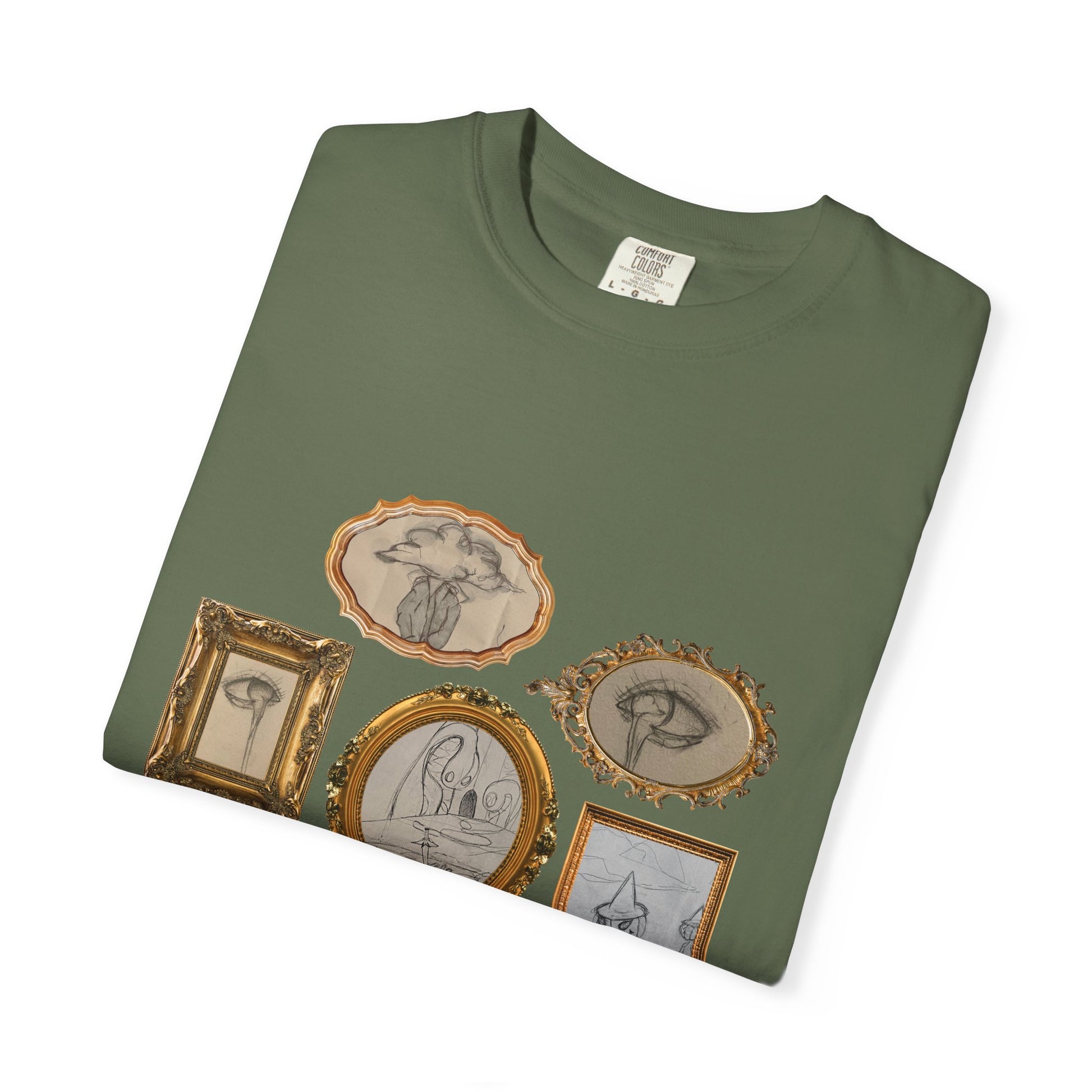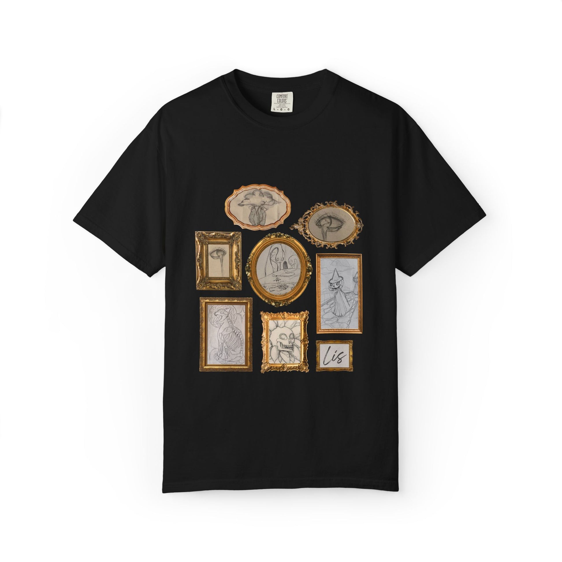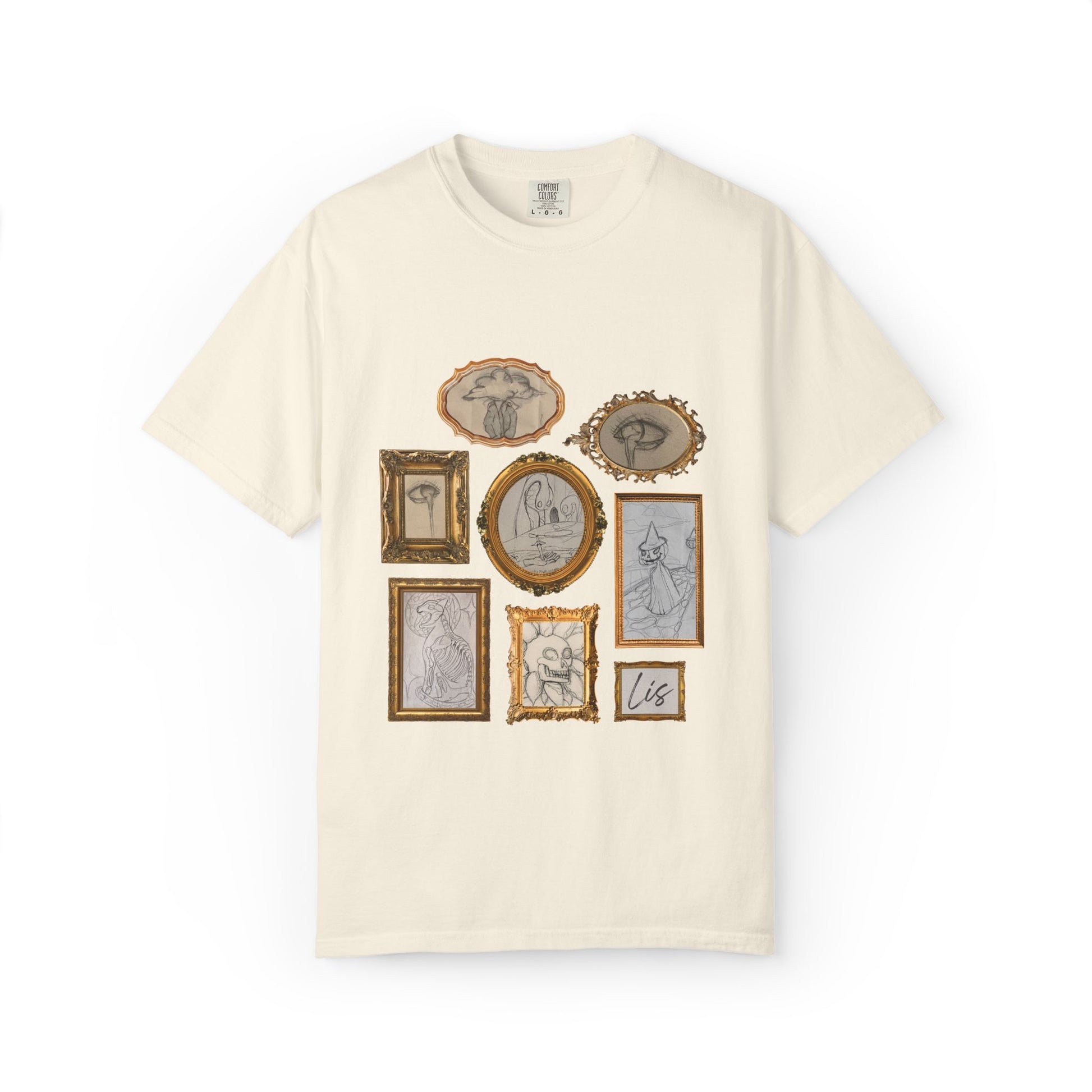 A gallery wall compiled of multiple paintings and illustrations created by Sabtiehl Studios. Stand out with a unique piece and blend in to any Fall themed outing. This soft-washed, garment-dyed fabric brings extra coziness to your wardrobe while the relaxed fit makes it an excellent daily choice. The double-needle stitching throughout the tee makes it highly durable while the lack of side-seams helps the shirt retain its tubular shape.